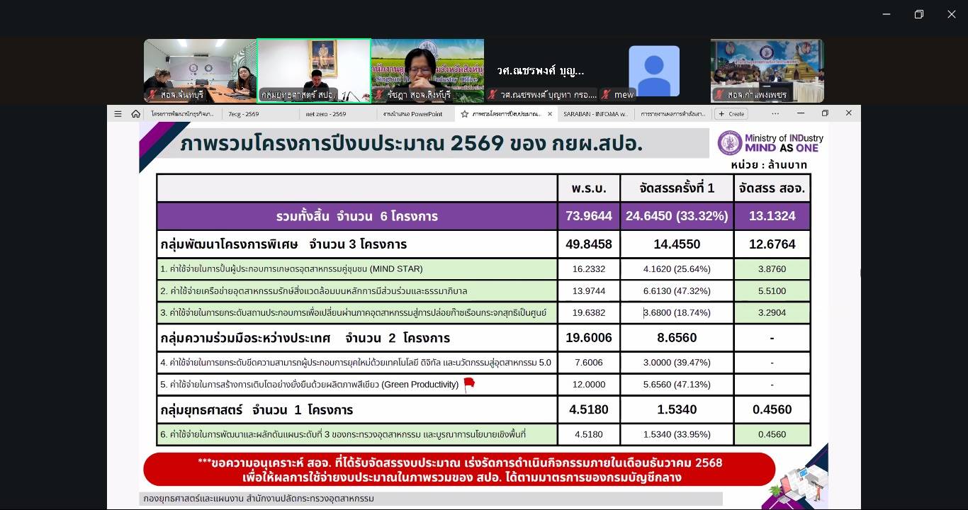 นายอภิรักษ์ อ่ำสุริยะ อุตสาหกรรมจังหวัดจันทบุรี มอบหมายให้ นางสาวธิดารัตน์ นามณีย์ นักวิชาการอุตสาหกรรมชำนาญการ พร้อมด้วยนายยุทธพงษ์ แก้วปัน วิศวกรชำนาญการ นางสาวลลิลทิพย์ นิลประไพ นักวิเคราะห์นโยบายและแผนชำนาญการ นางสาวพัณณิตา พวงศรี เจ้าหน้าที่บริหารงานทั่วไป นางสาวจิรภิญญา สมบูรณ์ชัย นักวิเคราะห์นโยบายและแผน นางสาวศลิษา หรินทรานนท์ นักวิเคราะห์นโยบายและแผน และนางสาวสิริวรรณ ชุ่มหัตถา เจ้าพนักงานธุรการ เข้าร่วมประชุมการชี้แจงแนวทางการดำเนินโครงการ ประจำปีงบประมาณ พ.ศ. 2569 ของกองยุทธศาสตร์และแผนงาน สำนักงานปลัดกระทรวงอุตสาหกรรม โดย นายธนวัฒน์ ไทยแก้ว ผู้อำนวยการกองยุทธศาสตร์และแผนงาน กล่าวเปิดการชี้แจง ผ่านระบบออนไลน์ (ZOOM Meeting)