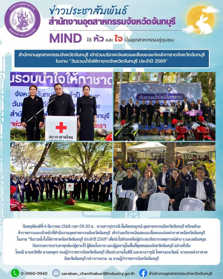 นางสาวสุวรรณี ลิ้มจิตสมบูรณ์ อุตสาหกรรมจังหวัดจันทบุรี พร้อมด้วย ข้าราชการและเจ้าหน้าที่สำนักงานอุตสาหกรรมจังหวัดจันทบุรี เข้าร่วมบริจาคเงินสดและสิ่งของแก่เหล่ากาชาดจังหวัดจันทบุรี ในงาน “วันรวมน้ำใจให้กาชาดจังหวัดจันทบุรี ประจำปี 2569” เพื่อนำไปช่วยเหลือผู้ประสบภัยจากเหตุการณ์ต่าง ๆ และสนับสนุนกิจกรรมการบรรเทาทุกข์แก่ผู้ยากไร้ ผู้ด้อยโอกาส และผู้สูงอายุในพื้นที่ชุมชนของจังหวัดจันทบุรีอย่างทั่วถึง โดยมี นายธวัชชัย นามสมุทร รองผู้ว่าราชการจังหวัดจันทบุรี เป็นประธานในพิธี และนางวารุณี ไพศาลธนวัฒน์ นายกเหล่ากาชาดจังหวัดจันทบุรี กล่าวรายงานถึงความสำคัญและวัตถุประสงค์ของการจัดงาน ณ จวนผู้ว่าราชการจังหวัดจันทบุรี
