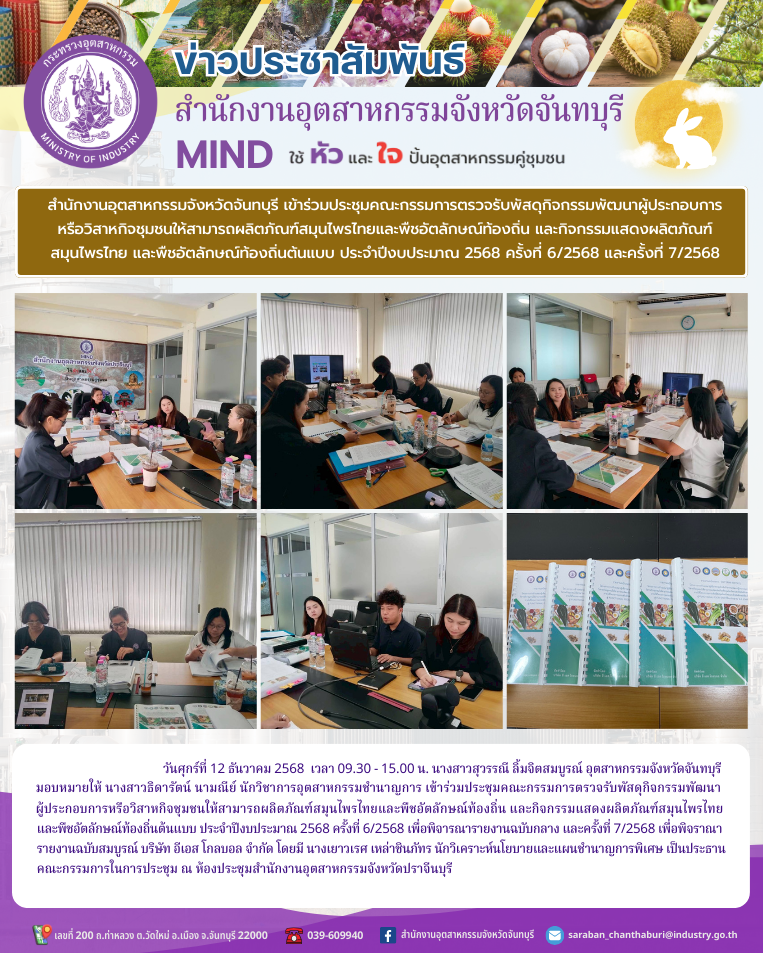 นางสาวสุวรรณี ลิ้มจิตสมบูรณ์ อุตสาหกรรมจังหวัดจันทบุรี มอบหมายให้ นางสาวธิดารัตน์ นามณีย์ นักวิชาการอุตสาหกรรมชำนาญการ