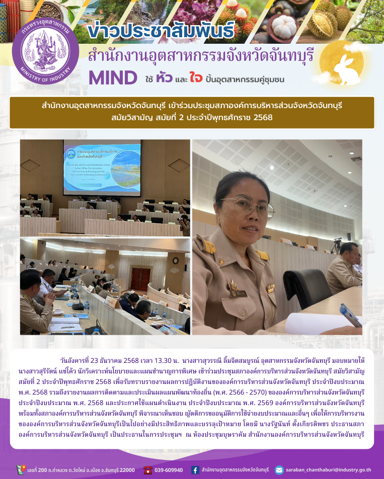 เข้าร่วมประชุมสภาองค์การบริหารส่วนจังหวัดจันทบุรี สมัยวิสามัญ สมัยที่ 2 ประจำปีพุทธศักราช 2568 เพื่อรับทราบรายงานผลการปฏิบัติงานขององค์การบริหารส่วนจังหวัดจันทบุรี ประจำปีงบประมาณ พ.ศ. 2568 รวมถึงรายงานผลการติดตามและประเมินผลแผนพัฒนาท้องถิ่น (พ.ศ. 2566 - 2570) ขององค์การบริหารส่วนจังหวัดจันทบุรี ประจำปีงบประมาณ พ.ศ. 2568 และประกาศใช้แผนดำเนินงาน ประจำปีงบประมาณ พ.ศ. 2569 องค์การบริหารส่วนจังหวัดจันทบุรี พร้อมทั้งสภาองค์การบริหารส่วนจังหวัดจันทบุรี พิจารณาเห็นชอบ ญัตติการขออนุมัติการใช้จ่ายงบประมาณและอื่นๆ เพื่อให้การบริหารงานขององค์การบริหารส่วนจังหวัดจันทบุรีเป็นไปอย่างมีประสิทธิภาพและบรรลุเป้าหมาย