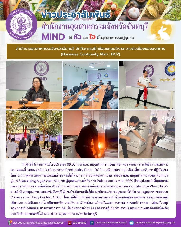 สำนักงานอุตสาหกรรมจังหวัดจันทบุรี จัดกิจกรรมฝึกซ้อมแผนบริหารความต่อเนื่องขององค์การ (Business Continuity Plan : BCP) กรณีเกิดภาวะฉุกเฉินเพื่อรองรับการปฏิบัติงานในภาวะวิกฤตหรือเหตุการณ์ฉุกเฉินต่างๆ ภายใต้โครงการการขับเคลื่อนงานบริการของสำนักงานอุตสาหกรรมจังหวัดจันทบุรีสู่การรับรองมาตรฐานศูนย์ราชการสะดวก คู่ชุมชนอย่างยั่งยืน ประจำปีงบประมาณ พ.ศ. 2569