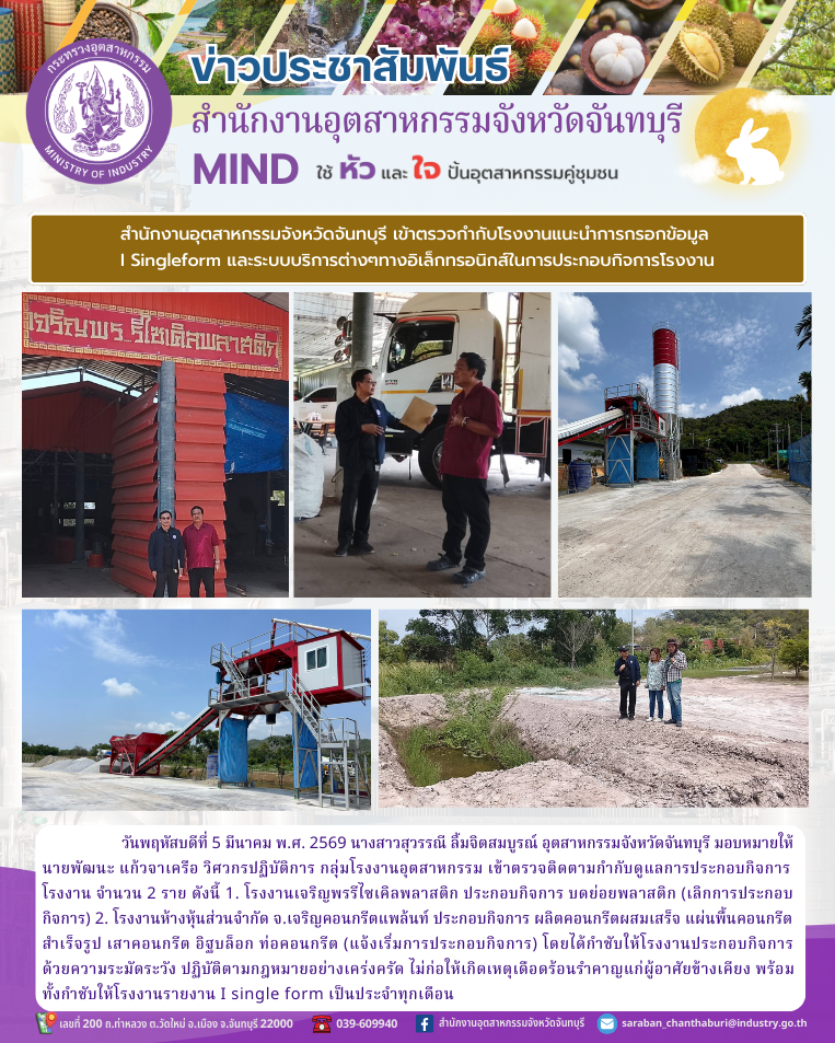 นางสาวสุวรรณี ลิ้มจิตสมบูรณ์ อุตสาหกรรมจังหวัดจันทบุรี มอบหมายให้นายพัฒนะ แก้วจาเครือ วิศวกรปฏิบัติการ กลุ่มโรงงานอุตสาหกรรม