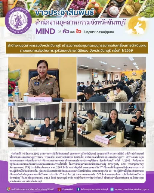 เข้าร่วมการประชุมคณะอนุกรรมการพัฒนาแรงงานและประสานงานการฝึกอาชีพจังหวัด (กพร.ปจ.) ครั้งที่ 1/2569 เพื่อพิจารณาทบทวนแผนพัฒนากำลังคนจังหวัดจันทบุรี พ.ศ. 2569 – 2570 (ตามแนวทางของ กพร.ปช. กำหนด) แนวทางการขับเคลื่อนแผนพัฒนากำลังคนระดับจังหวัดประจำปีงบประมาณ พ.ศ. 2569 และกำหนดการจัดงานแข่งขันฝีมือแรงงานแห่งชาติ ครั้งที่ 31 ระดับภาค จัดขึ้นระหว่างวันที่ 8 – 10 กรกฎาคม 2569