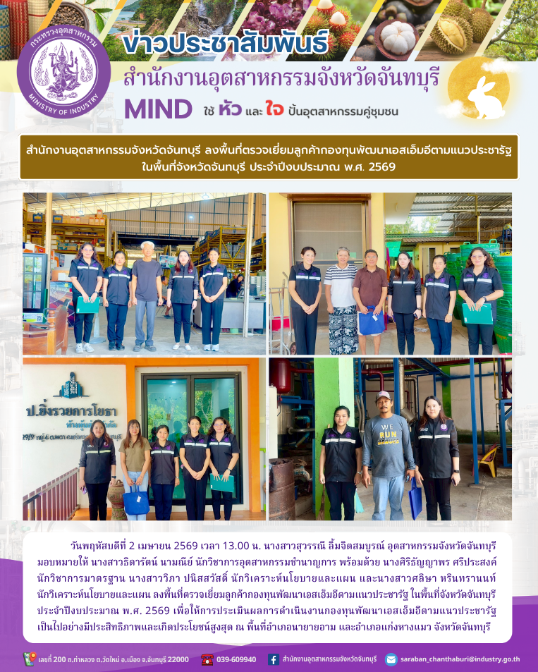 ลงพื้นที่ตรวจเยี่ยมลูกค้ากองทุนพัฒนาเอสเอ็มอีตามแนวประชารัฐ ในพื้นที่จังหวัดจันทบุรี ประจำปีงบประมาณ พ.ศ. 2569 เพื่อให้การประเมินผลการดำเนินงานกองทุนพัฒนาเอสเอ็มอีตามแนวประชารัฐเป็นไปอย่างมีประสิทธิภาพและเกิดประโยชน์สูงสุด