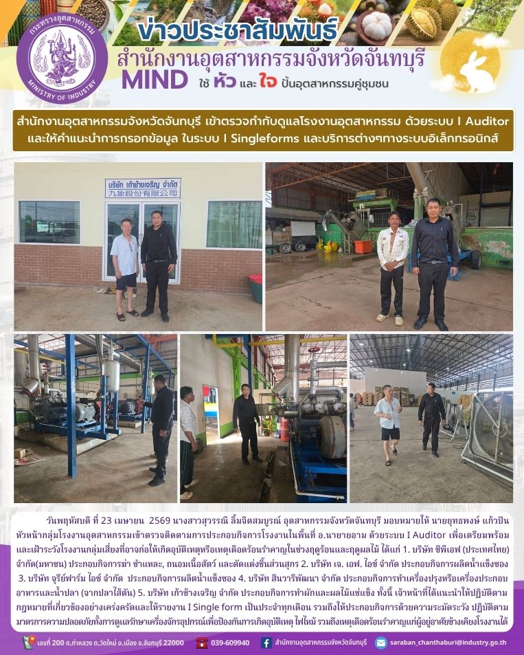 เข้าตรวจติดตามการประกอบกิจการโรงงานในพื้นที่ อ.นายายอาม ด้วยระบบ I Auditor เพื่อเตรียมพร้อมและเฝ้าระวังโรงงานกลุ่มเสี่ยงที่อาจก่อให้เกิดอุบัติเหตุหรือเหตุเดือดร้อนรำคาญในช่วงฤดูร้อนและฤดูผลไม้ ได้แก่
