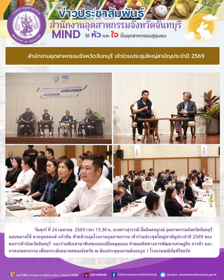 เข้าร่วมประชุมใหญ่สามัญประจำปี 2569 ของหอการค้าจังหวัดจันทบุรี และร่วมฟังเสวนาพิเศษแลกเปลี่ยนมุมมอง กำหนดทิศทางการพัฒนาเศรษฐกิจ การค้า และภาคเกษตรกรรม เพื่อยกระดับอนาคตของจังหวัด